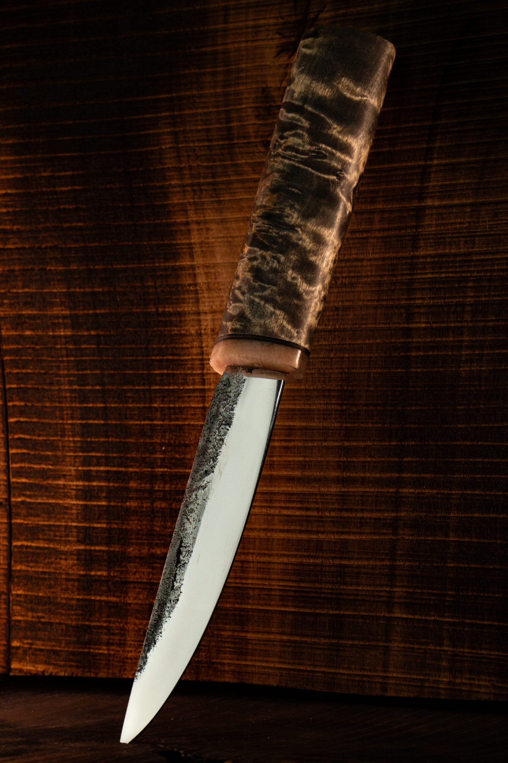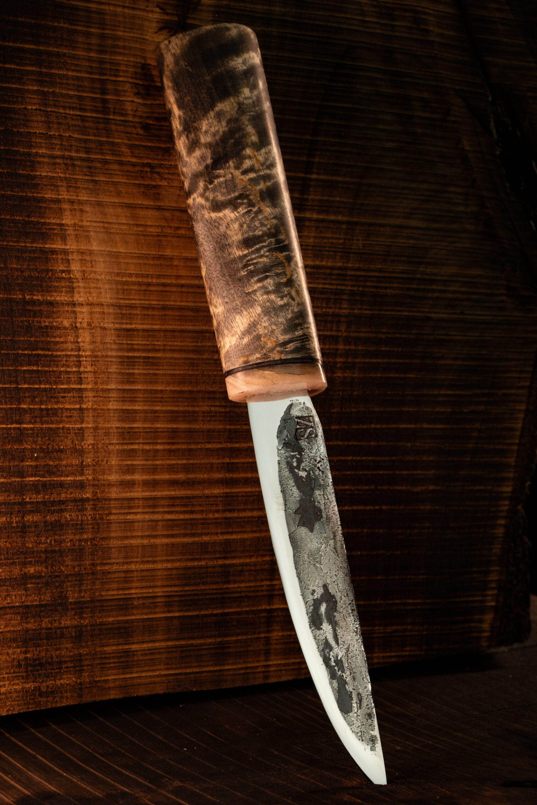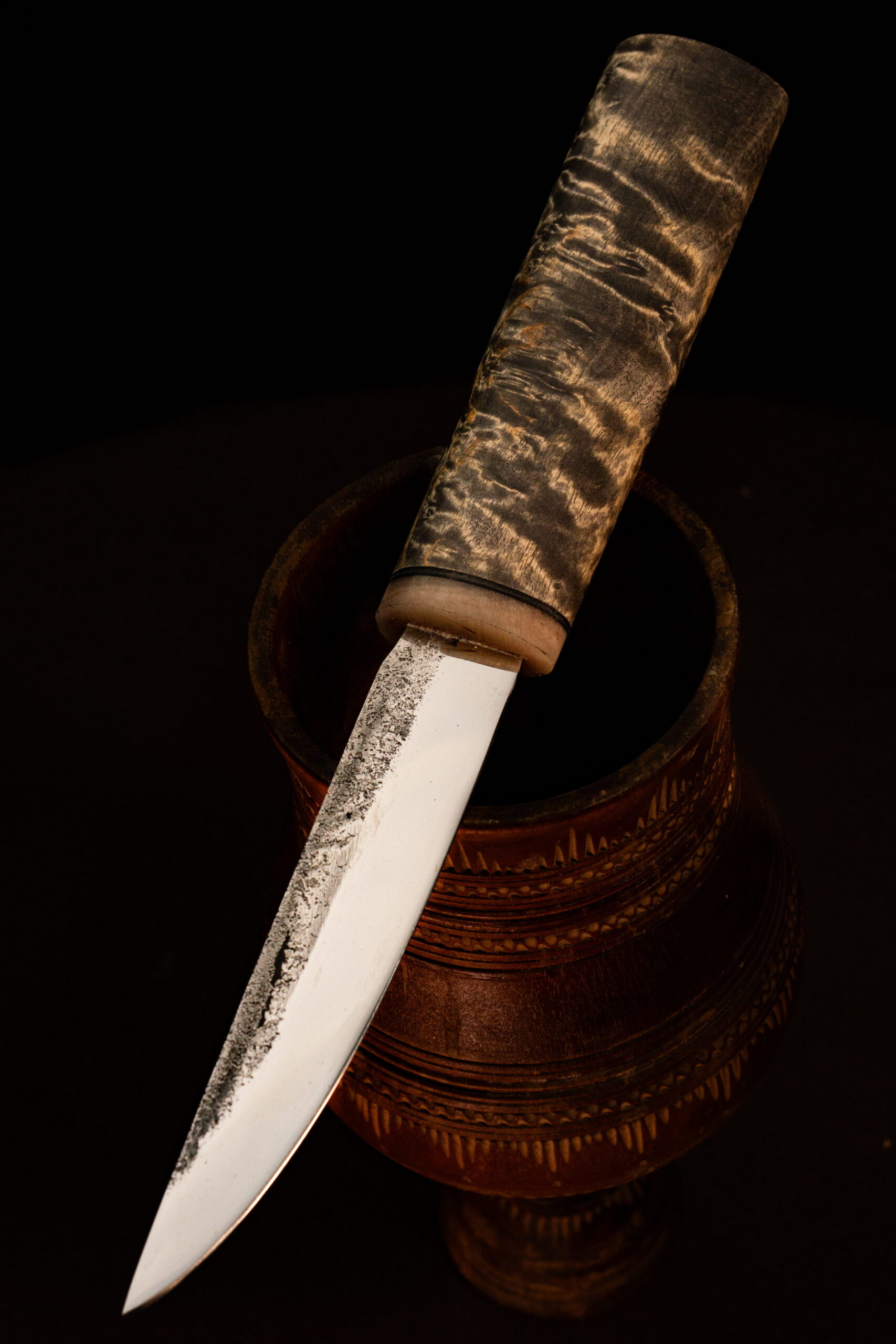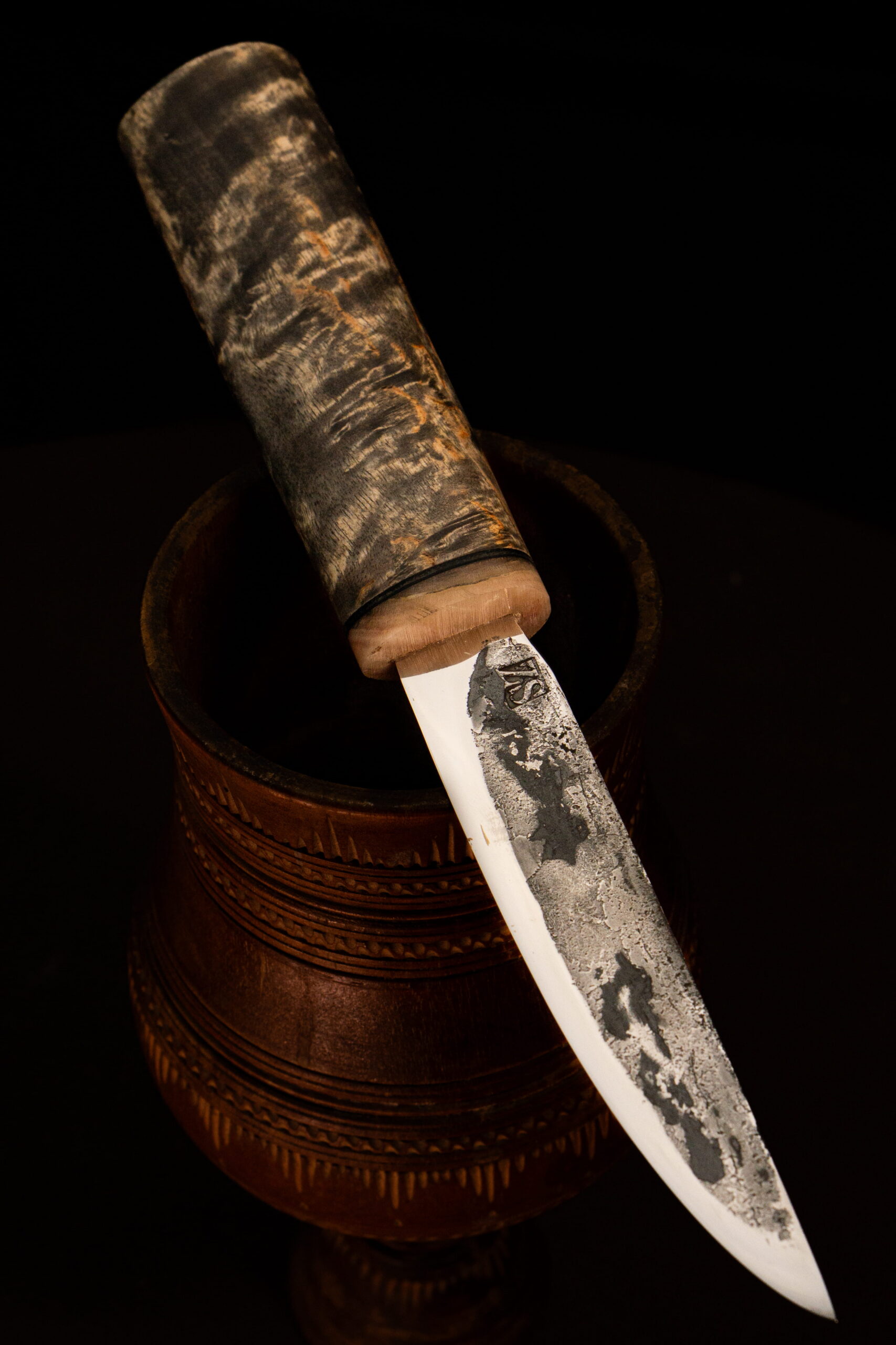 Wipe the blade dry after each use. Store the knife in its sheath in a dry place. Periodically oil the blade to prevent corrosion. The wooden handle can be treated with linseed oil.